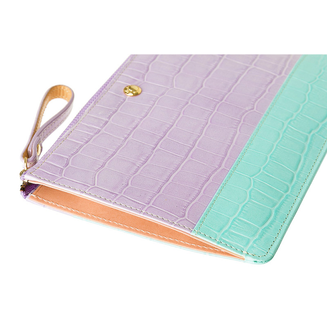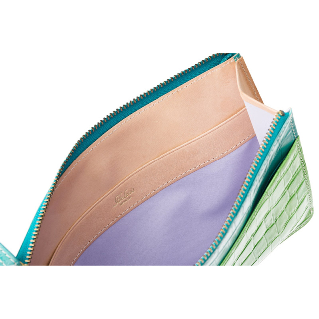 発色がきれいなクロコの型押し革を色違いのコンビネーションに仕上げました。