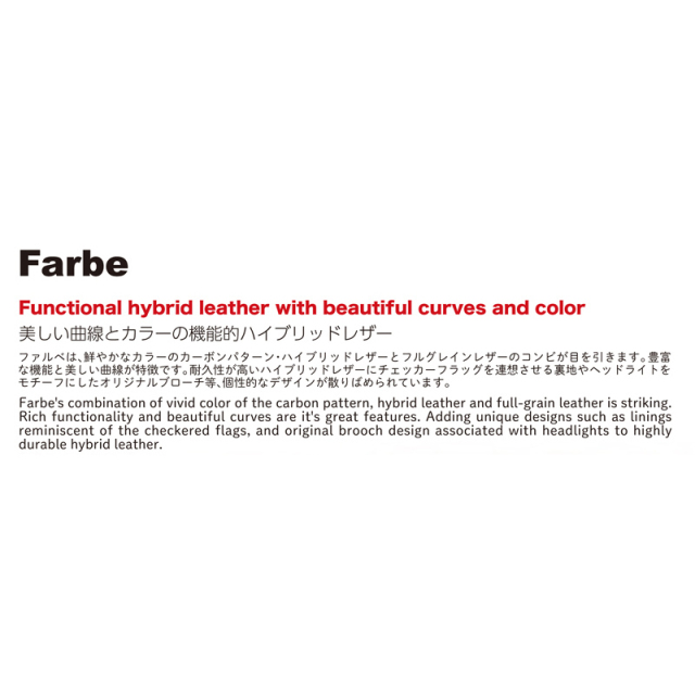 カーボンパターンの入った鮮やかなハイブリッドレザーのカラーとコンビで合わせたフルグレインレザーの美しい曲線が特徴です。